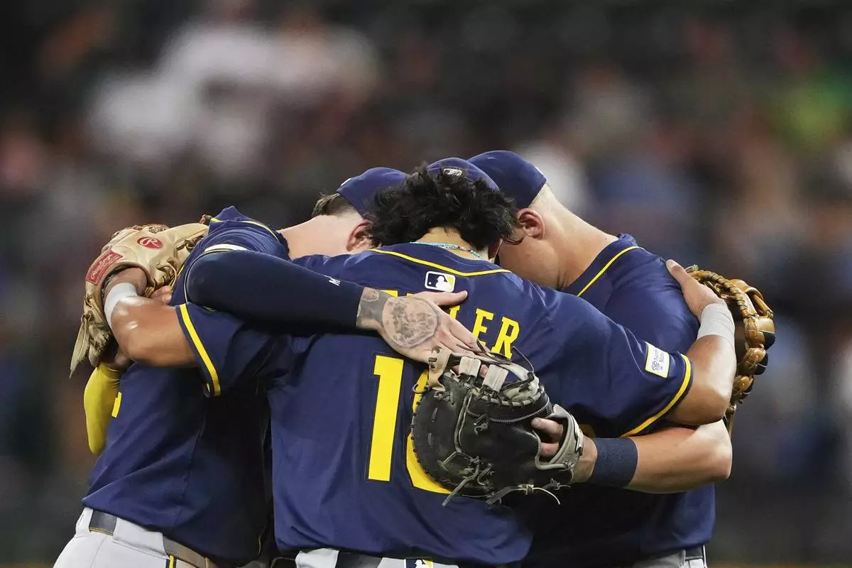 The Milwaukee Brewers infield, including third baseman Anthony Seigler (18) celebrate a win over the Seattle Mariners in a baseball game Monday, July 21, 2025, in Seattle. (AP Photo/Lindsey Wasson)