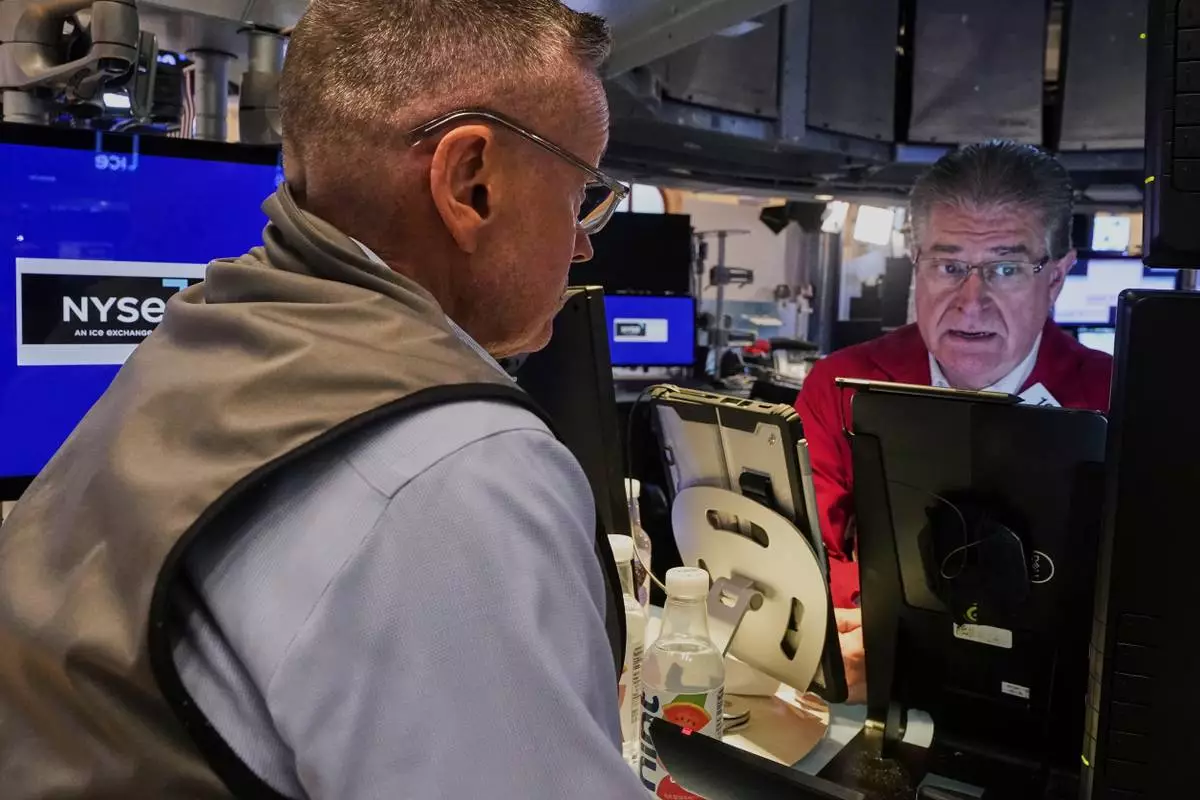 Traders Neil Catania, left, and Daniel Kryger work on the floor of the New York Stock Exchange, Monday, July 21, 2025. (AP Photo/Richard Drew)
