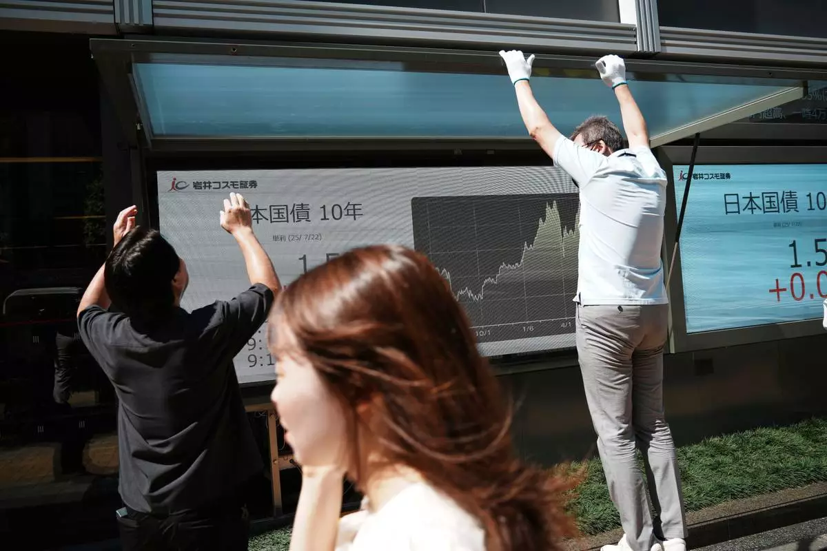 Maintenance workers repair an electronic board of financial indexes, at a securities firm Tuesday, July 22, 2025, in Tokyo. (AP Photo/Eugene Hoshiko)