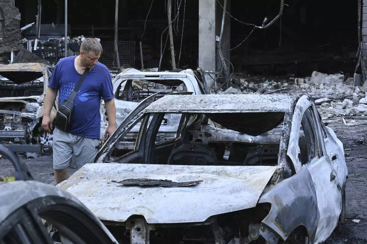 A resident looks at damaged cars at a residential area following Russia's drone attack in Odesa, Ukraine, Tuesday, July 22, 2025. (AP Photo/Michael Shtekel)