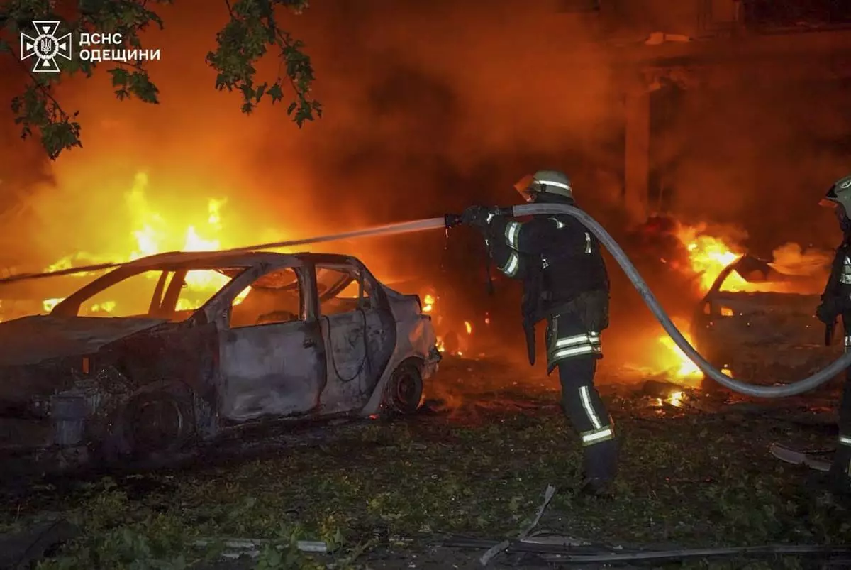 In this photo provided by the Ukrainian Emergency Service, emergency services personnel work to extinguish a fire following a Russian attack in Odesa, Ukraine, Tuesday, July 22, 2025. (Ukrainian Emergency Service via AP)