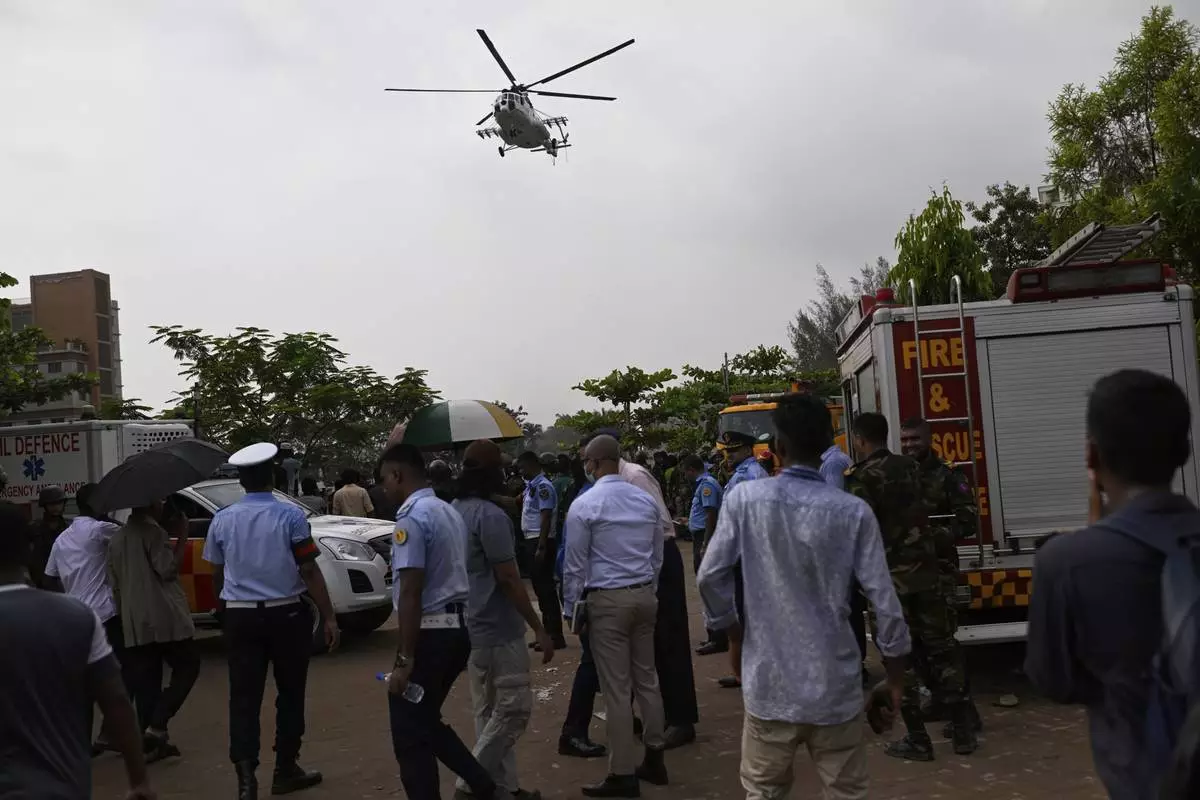 A helicopter carrying injured victims of a Bangladesh Air Force training aircraft crash in Dhaka, Bangladesh, Monday, July 21, 2025. (AP Photo/Mahmud Hossain Opu)