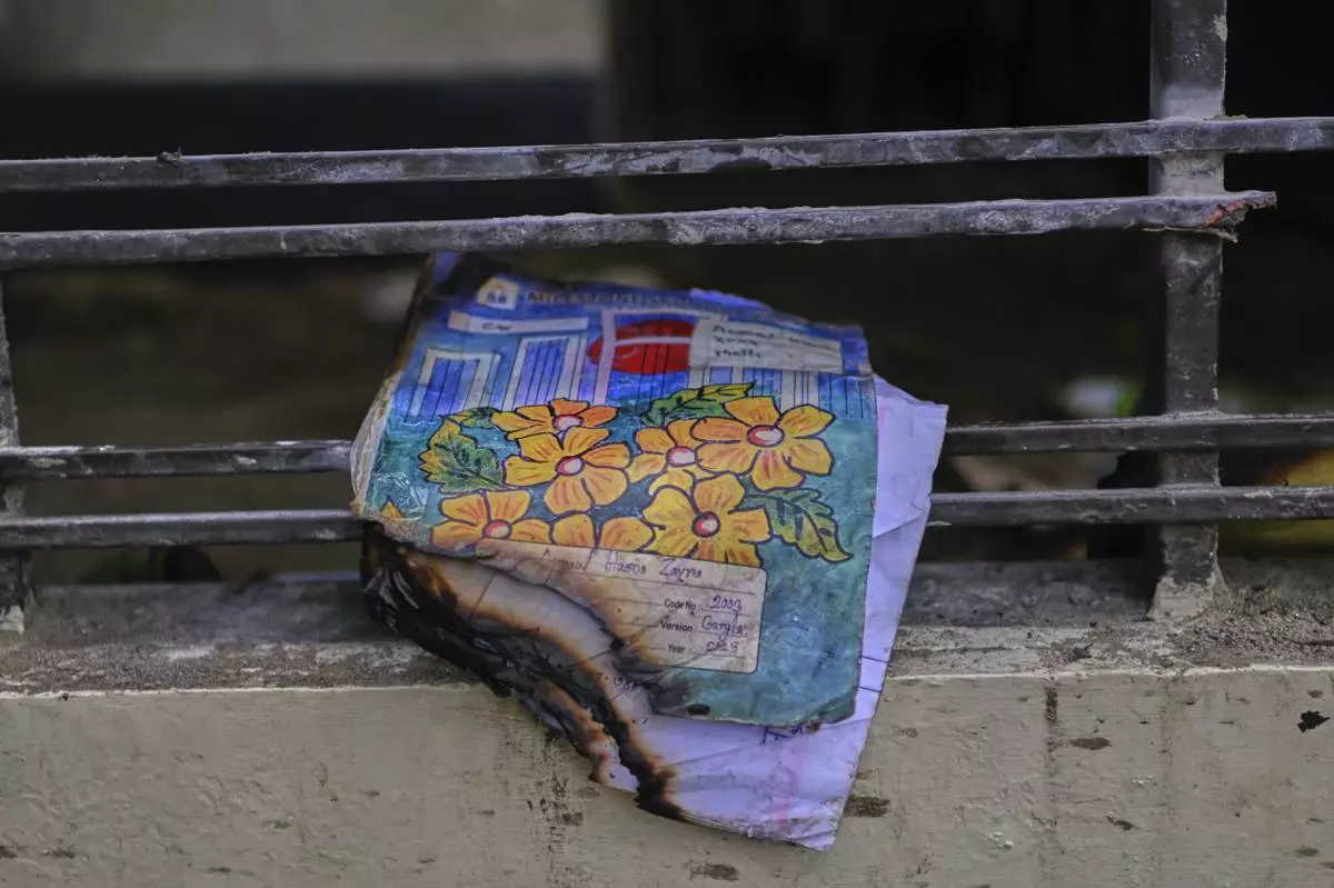 A burnt book of a student is seen at the window of a school after a Bangladesh air force training jet crashed into it Monday in Dhaka, Bangladesh, Tuesday, July 22, 2025. (AP Photo/Mahmud Hossain Opu)