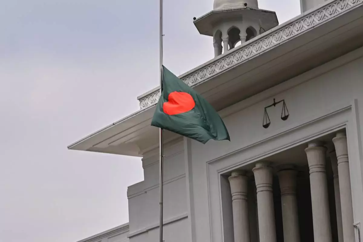 Bangladesh's national flag keeps half-mast on Supreme Court building in homage to the victims of Monday's Bangladesh air force training aircraft crash into a school in Dhaka, Bangladesh, Tuesday, July 22, 2025.( AP Photo/ Mahmud Hossain Opu)