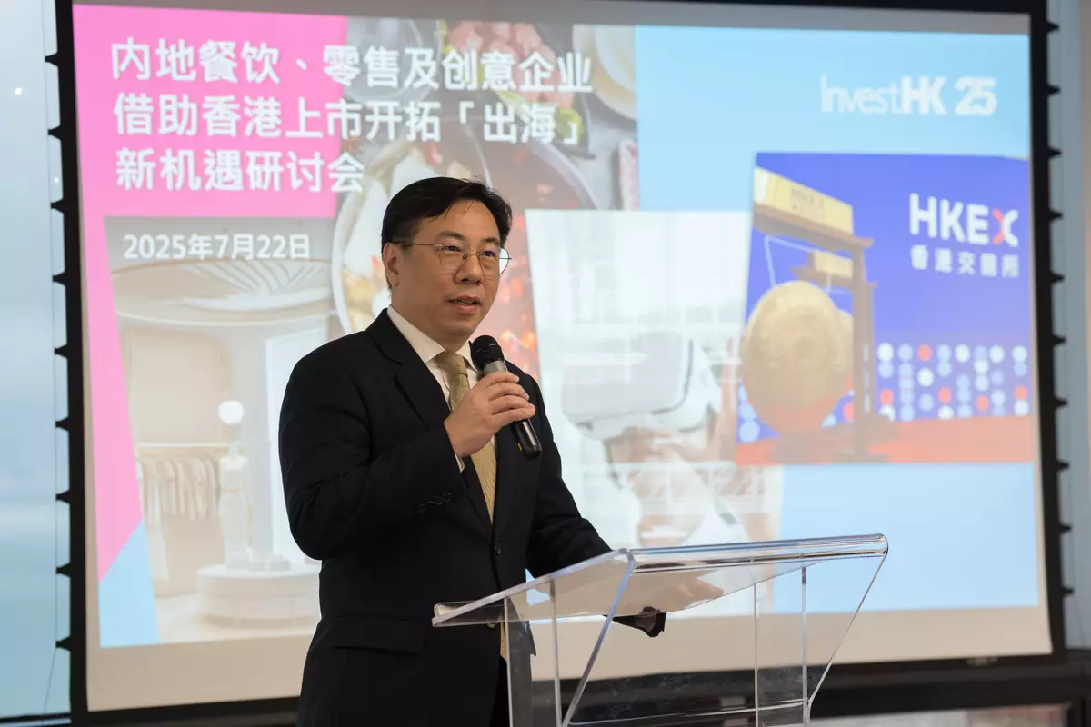 Invest Hong Kong (InvestHK) today (July 22) hosted a seminar in a hybrid format (both online and offline) to explore how Mainland food and beverage (F&B), retail and creative companies can seize new "go global" opportunities by leveraging Hong Kong's strengths as an international financial centre. By listing in Hong Kong, companies can tap into overseas markets and accelerate their global expansion. The event attracted over 110 corporate representatives to participate and received enthusiastic feedback. Participants learned about Hong Kong's unique advantages in supporting global business expansion and expressed strong interest in future opportunities.