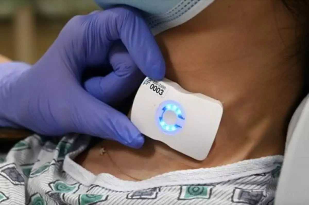 FloPatch, a wearable Doppler ultrasound device, is applied to the neck to measure real-time blood flow and help clinicians make faster, more personalized treatment decisions.
