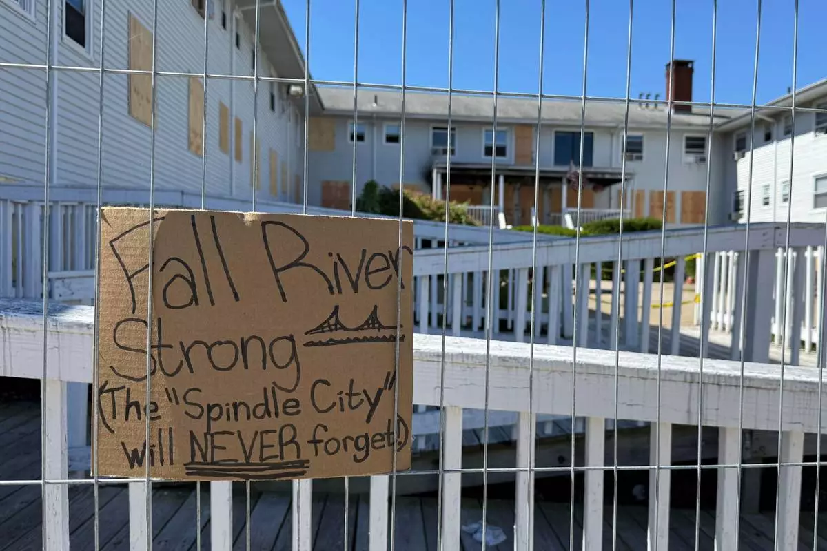A handwritten sign is propped outside the Gabriel House on Tuesday, July 22, 2025, more than a week after a deadly fire at that assisted-living facility in Fall River, Mass. (AP Photo/Rodrique Ngowi)