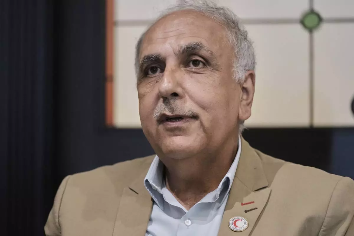 Dr. Mohammed Hazem Baqleh, president of the Syrian Arab Red Crescent, speaks during an interview with The Associated Press at the Habtoor Grand Hotel in the Sin el-Fil suburb of Beirut, Lebanon, Tuesday, July 22, 2025. (AP Photo/Bilal Hussein)