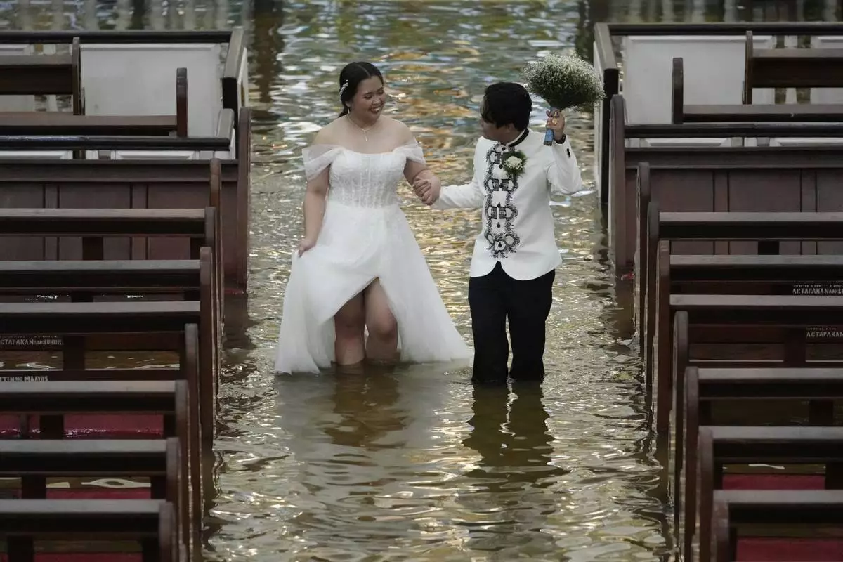 MALOLOS, Philippines (AP) — Jade Rick Verdillo and Jamaica Aguilar were determined to walk down the aisle on their wedding day. Even if it meant walking down a flooded one.