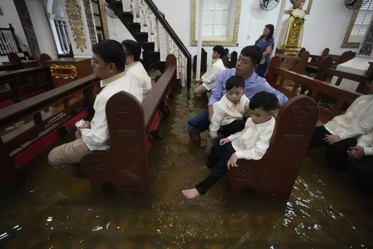 Guests attend a wedding at the flooded Barasoain church in Malolos, Bulacan province, Philippines on Tuesday, July 22, 2025. (AP Photo/Aaron Favila)
