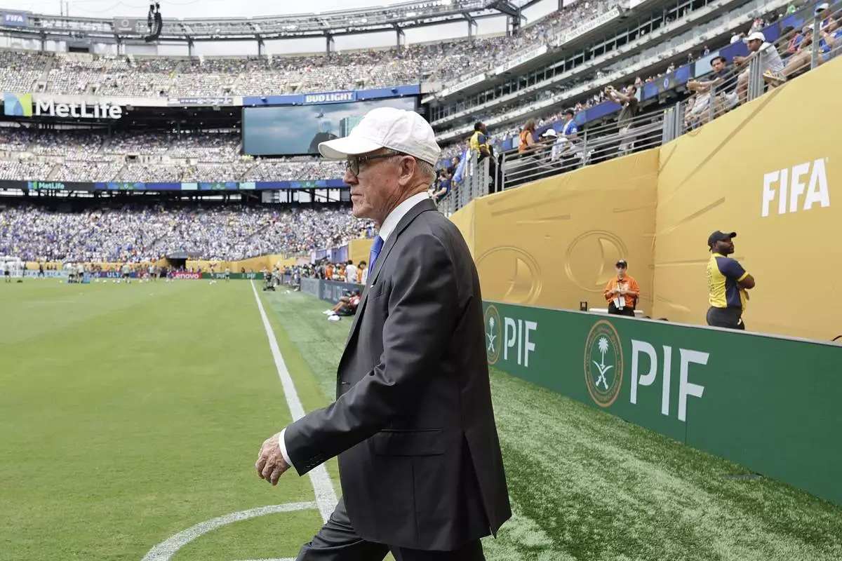 New York Jets owner Woody Johnson walks on the field before the Club World Cup final soccer match between Chelsea and PSG in East Rutherford, N.J., Sunday, July 13, 2025. (AP Photo/Adam Hunger)