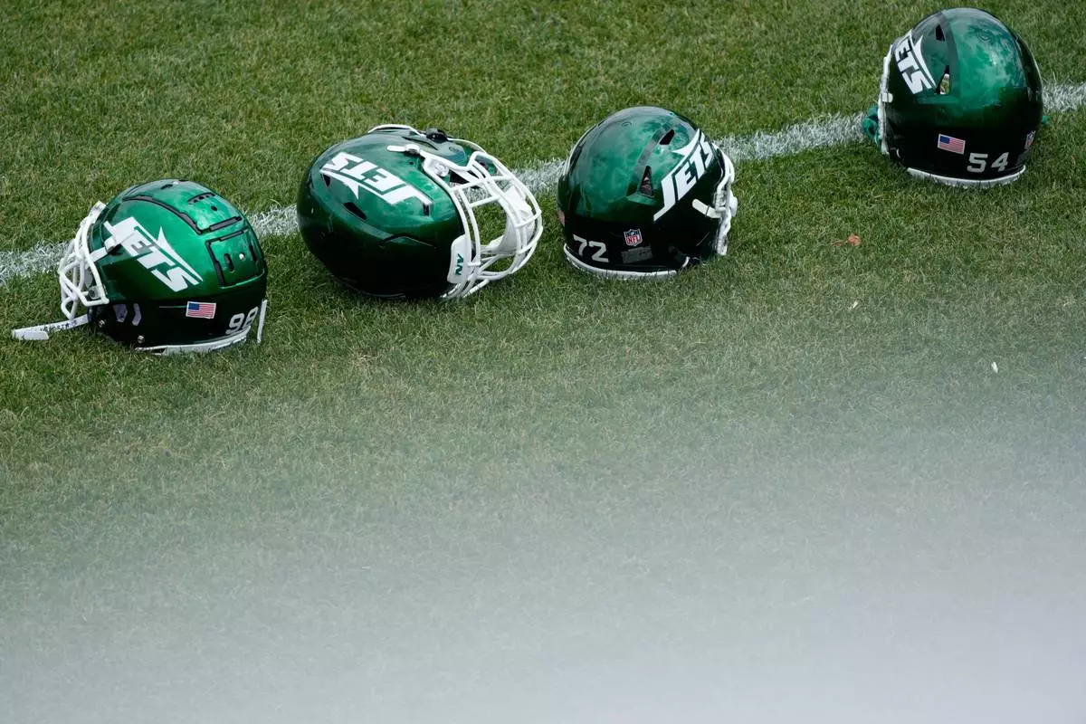 FILE - New York Jets helmets sit on the ground during practice at the NFL football team's training facility in Florham Park, N.J., June 11, 2024. (AP Photo/Pamela Smith, file)