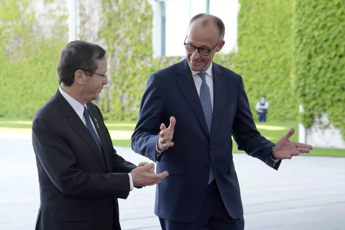 FILE - German Chancellor Friedrich Merz, right, welcomes Israeli President Isaac Herzog for a meeting at the chancellery in Berlin, Germany, on May 12, 2025. (AP Photo/Markus Schreiber, File)
