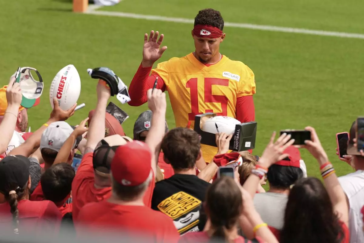 Kansas City Chiefs quarterback Patrick Mahomes greets fans at NFL football training camp Tuesday, July 22, 2025, in St. Joseph, Mo. (AP Photo/Charlie Riedel)