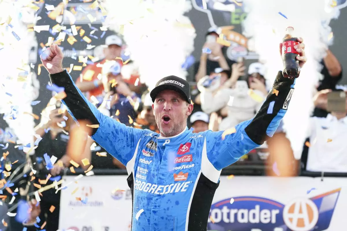 Denny Hamlin celebrates in Victory Lane after winning a NASCAR Cup Series auto race at Dover Motor Speedway, Sunday, July 20, 2025, in Dover, Del. (AP Photo/Derik Hamilton)