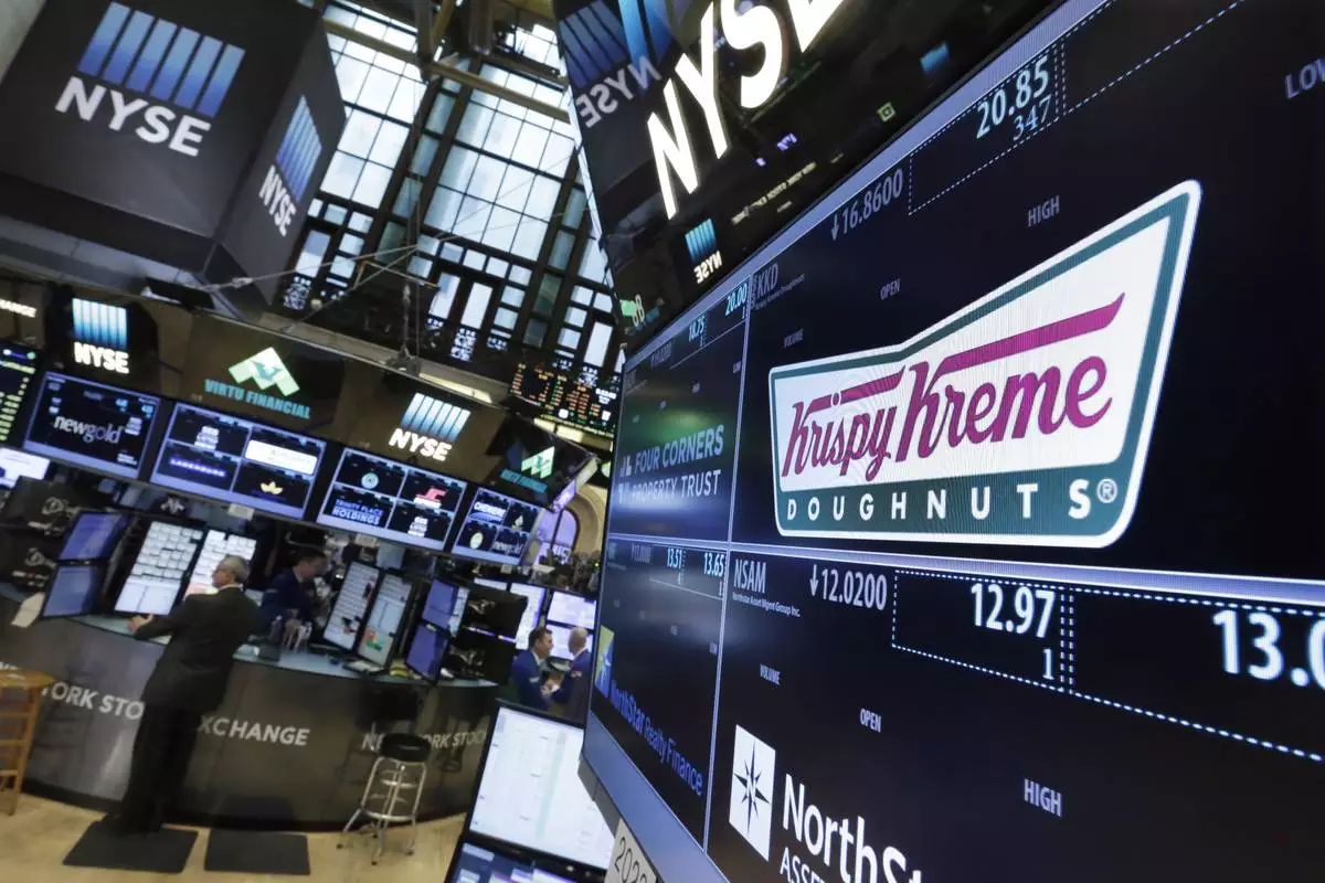FILE - The Krispy Kreme logo appears above its trading post on the floor of the New York Stock Exchange, Monday, May 9, 2016. (AP Photo/Richard Drew, File)