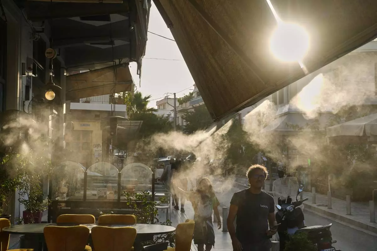 Pedestrians walk next to a mist machine in Thisio district of Athens during a heatwave, Tuesday, July 22, 2025.(AP Photo/Petros Giannakouris)