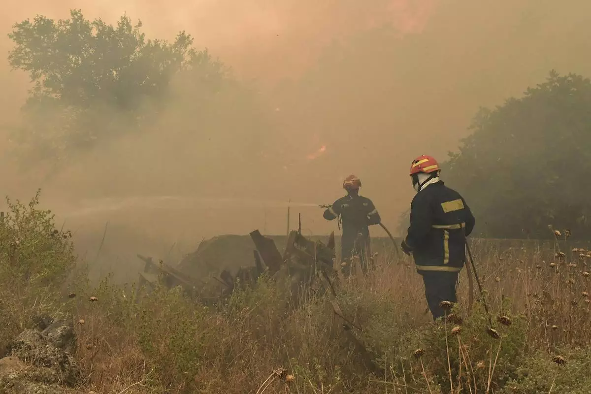 Firefighters try to extinguish a major forest fire in the village of Karteri, near Corinth, west of Athens, Greece, on Tuesday, July 22, 2025. (AP Photo/Vasilis Psomas)