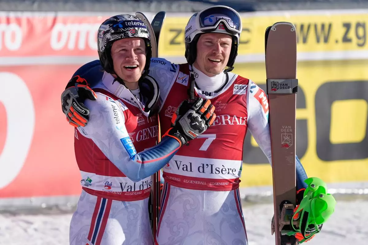 Norway's Timon Haugan, left, winner of an alpine ski, men's World Cup slalom event, celebrates with second placed fellow-countryman Henrik Kristoffersen, in Val d'Isere, France, Sunday Dec. 14, 2025. (AP Photo/Giovanni Auletta)