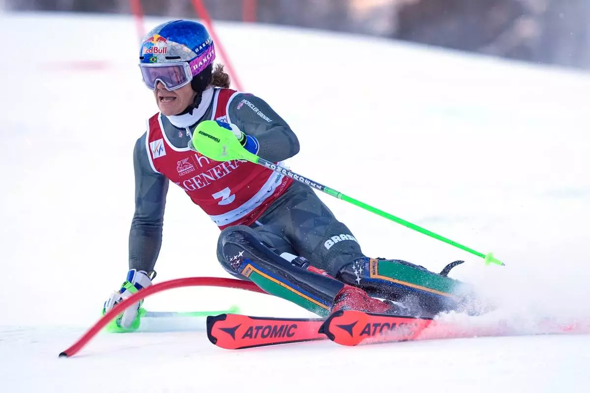 Brazil's Lucas Pinheiro Braathen speeds down the course during an alpine ski, men's World Cup slalom event, in Val d'Isere, France, Sunday Dec. 14, 2025. (AP Photo/Giovanni Auletta)
