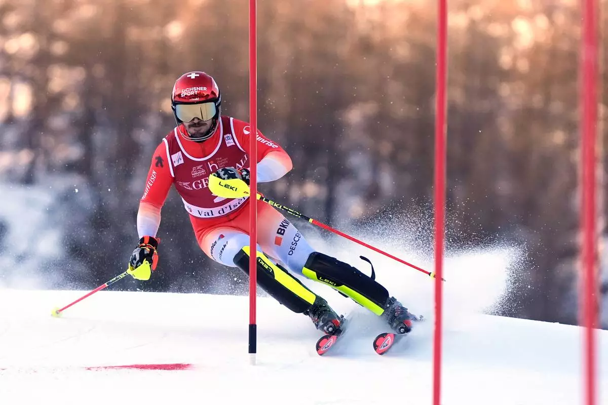 Switzerland's Loic Meillard speeds down the course during an alpine ski, men's World Cup slalom event, in Val d'Isere, France, Sunday Dec. 14, 2025. (AP Photo/Giovanni Auletta)