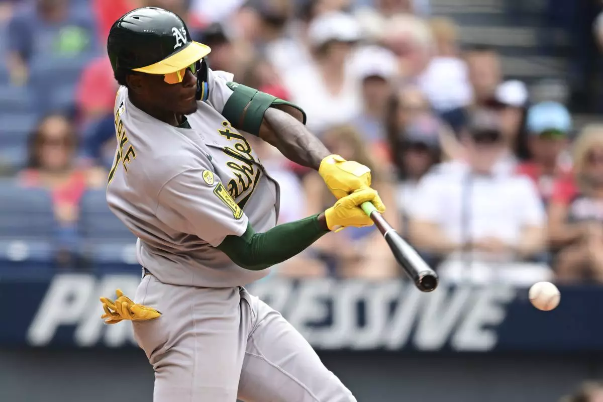 Athletics' Denzel Clarke hits a double during the eighth inning of a baseball game against the Cleveland Guardians, Sunday, July 20, 2025, in Cleveland. (AP Photo/David Dermer)