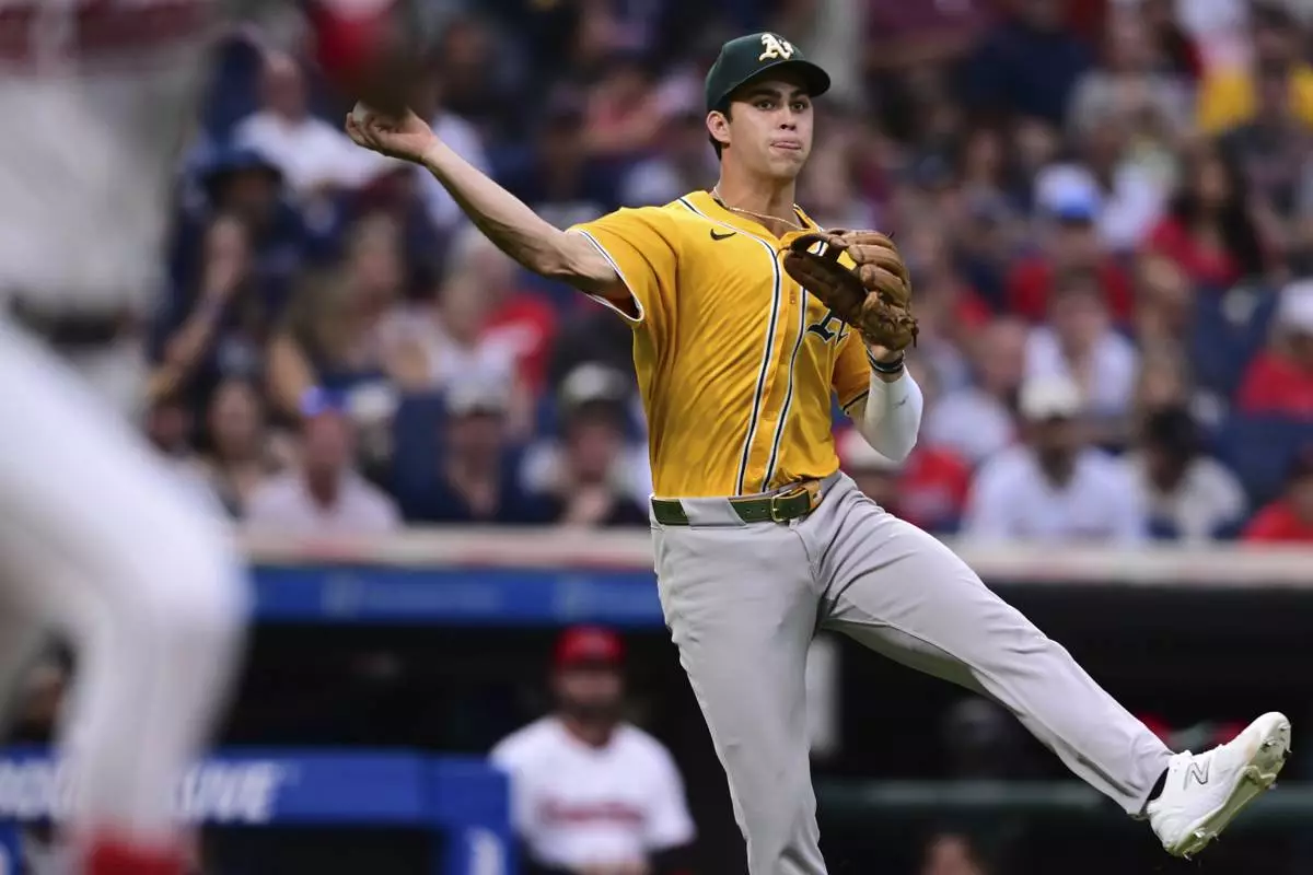 Athletics third basemen Max Muncy throws to put out Cleveland Guardians' Brayan Rocchio during the third inning of a baseball game, Saturday, July 19, 2025, in Cleveland. (AP Photo/David Dermer)