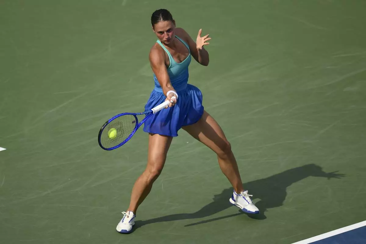 Marta Kostyuk, of Ukraine, returns the ball to Emma Raducanu, of Britain, during a match at the Citi Open tennis tournament Tuesday, July 22, 2025, in Washington. (AP Photo/Nick Wass)