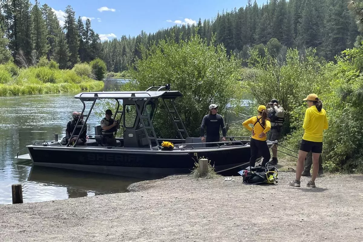 This photo provided by the Deschutes County Sheriff's Office shows search and rescue teams on the Deschutes River about 10 miles from Bend, Ore., after a fatal waterfall accident Saturday, July 19, 2025. (Deschutes County Sheriff's Office via AP)