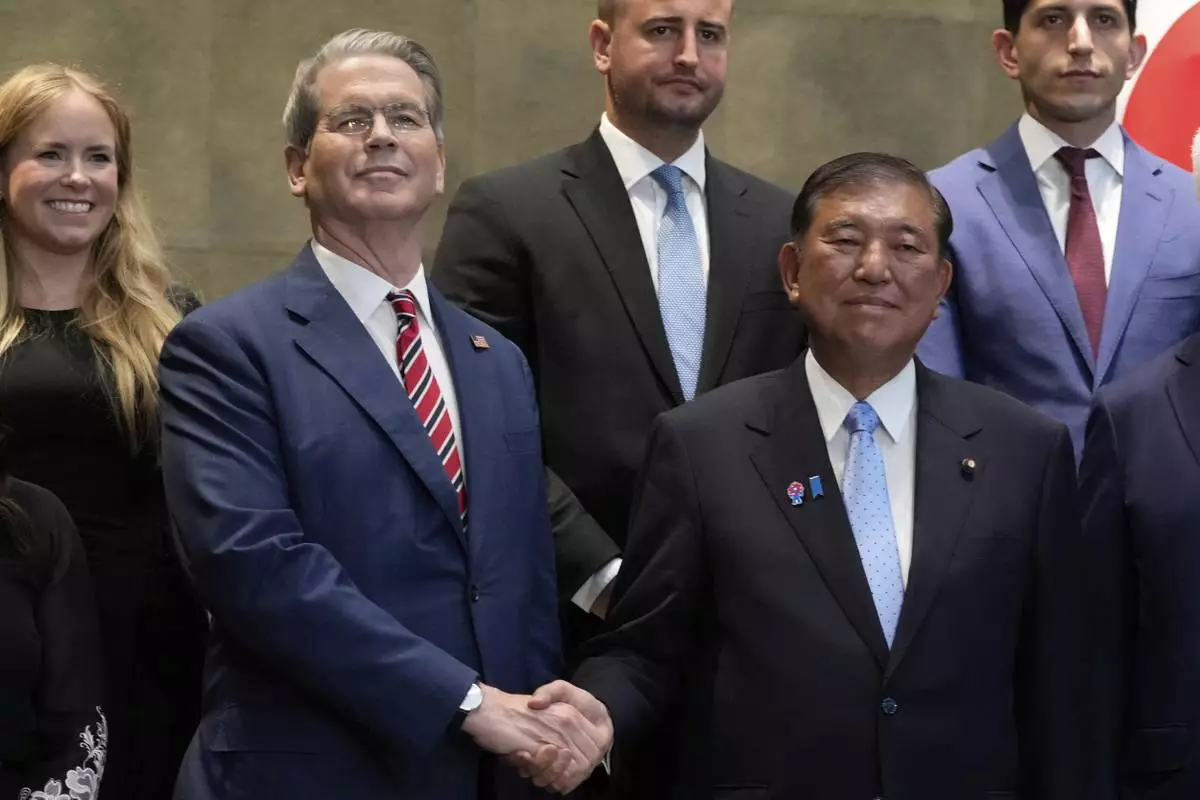 Japanese Prime Minister Shigeru Ishiba, right, shakes hands with U.S. Treasury Secretary Scott Bessent before their meeting at the prime minister's office in Tokyo, Japan, Friday, July 18, 2025. (AP Photo/Shuji Kajiyama, Pool)