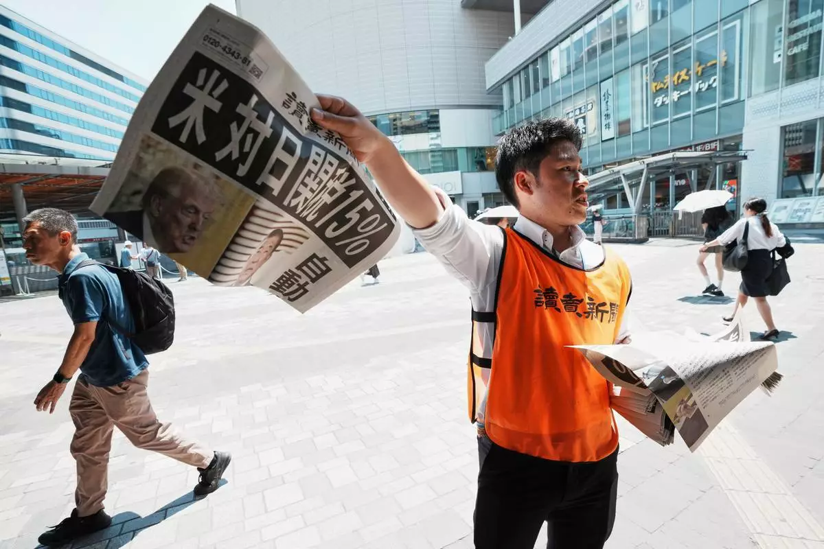 A staff member distributes an extra edition of the Yomiuri Shimbun newspaper reporting that President Donald Trump announced a trade framework with Japan on Tuesday, Wednesday, July 23, 2025, in Tokyo. The headline reads "U.S., a 15% tax on goods imported from Japan." (AP Photo/Eugene Hoshiko)