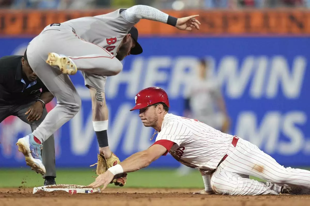 Philadelphia Phillies' Max Kepler, right, steals second base past Boston Red Sox shortstop Trevor Story during the sixth inning of a baseball game Tuesday, July 22, 2025, in Philadelphia. (AP Photo/Matt Slocum)