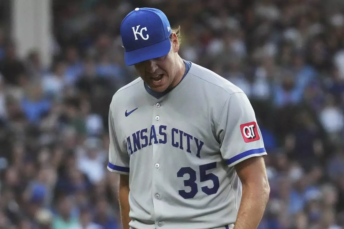 Kansas City Royals starting pitcher Rich Hill reacts as he walks back to the dugout after the second inning of a baseball game against the Chicago Cubs in Chicago, Tuesday, July 22, 2025. (AP Photo/Nam Y. Huh)