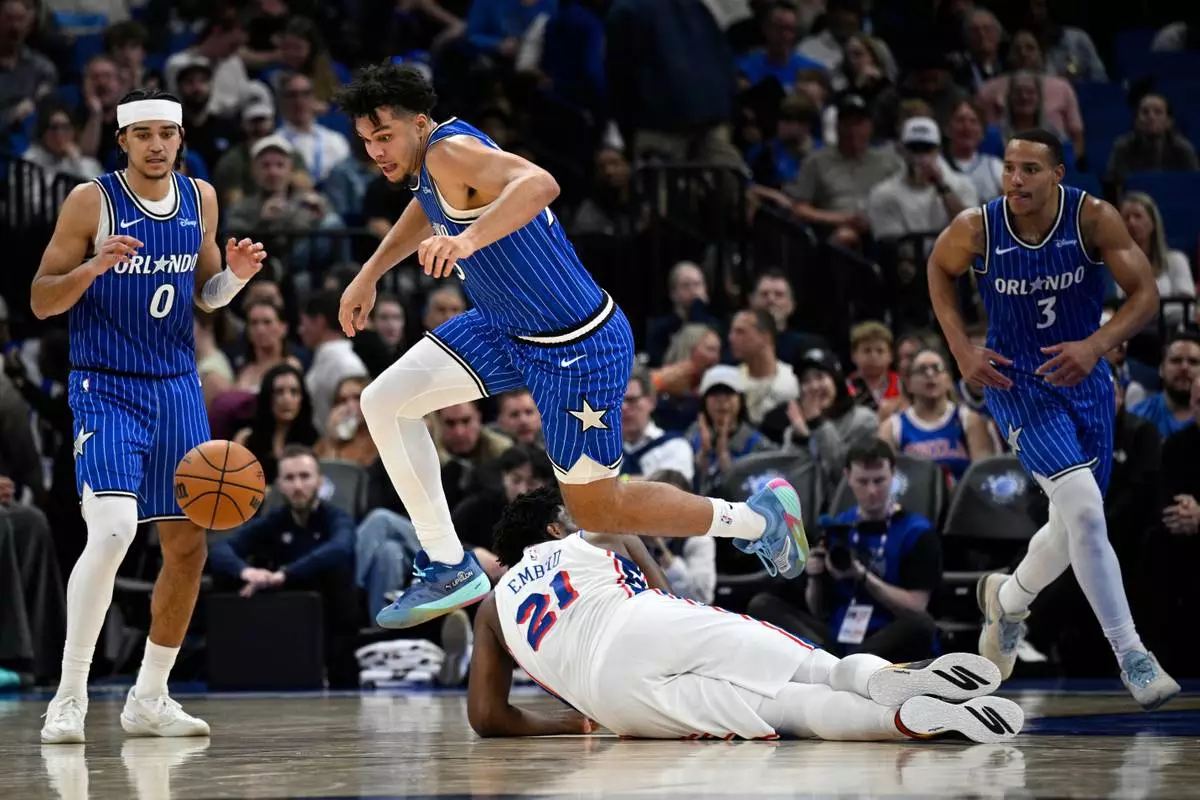 Orlando Magic forward Noah Penda, front, steals the ball from Philadelphia 76ers center Joel Embiid (21) during the second half of an NBA basketball game, Friday, Jan. 9, 2026, in Orlando, Fla. (AP Photo/Phelan M. Ebenhack)
