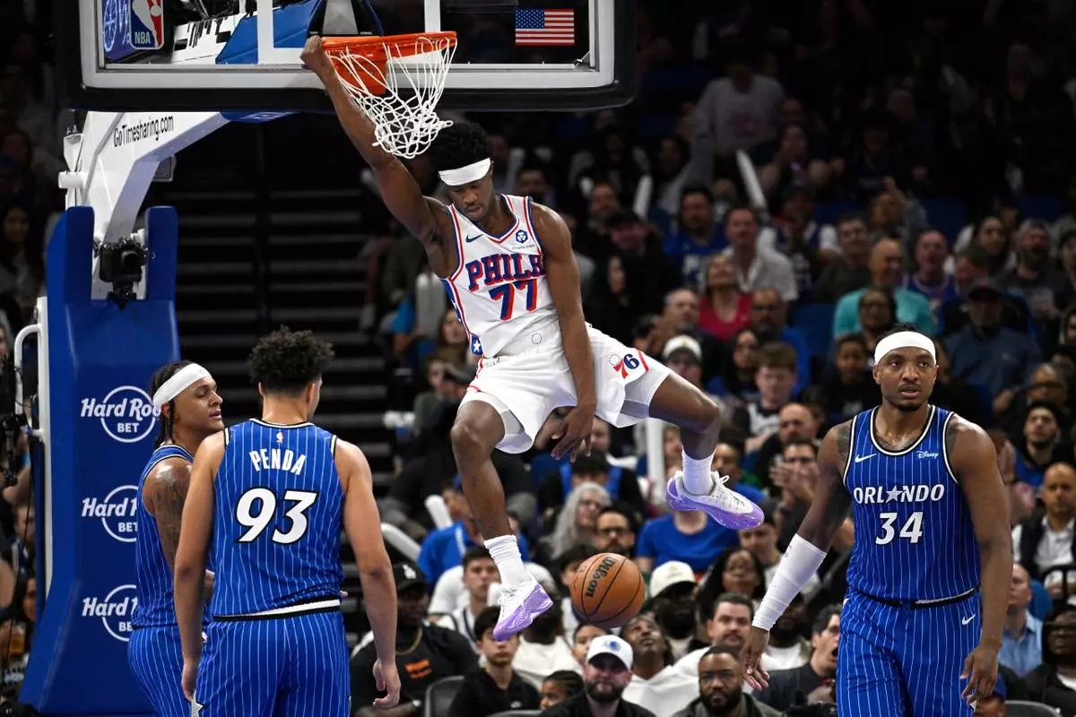 Philadelphia 76ers guard VJ Edgecombe (77) dunks between Orlando Magic forward Paolo Banchero, left, forward Noah Penda (93) and center Wendell Carter Jr. (34) during the first half of an NBA basketball game, Friday, Jan. 9, 2026, in Orlando, Fla. (AP Photo/Phelan M. Ebenhack)
