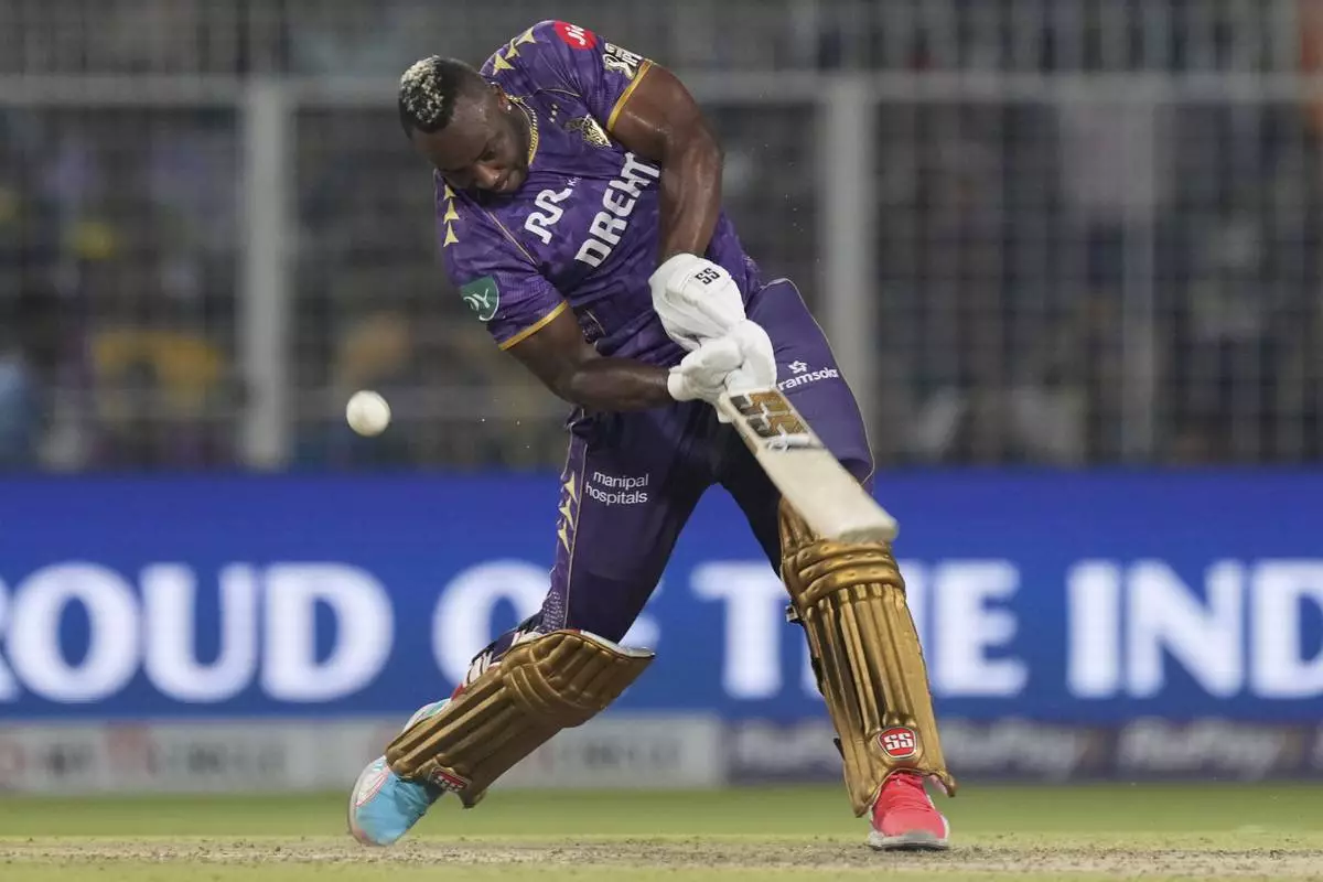 FILE - Kolkata Knight Riders' Andre Russell bats during the Indian Premier League cricket match between Kolkata Knight Riders and Chennai Super Kings at Eden Gardens in Kolkata, India, May 7, 2025. (AP Photo/Bikas Das, File)