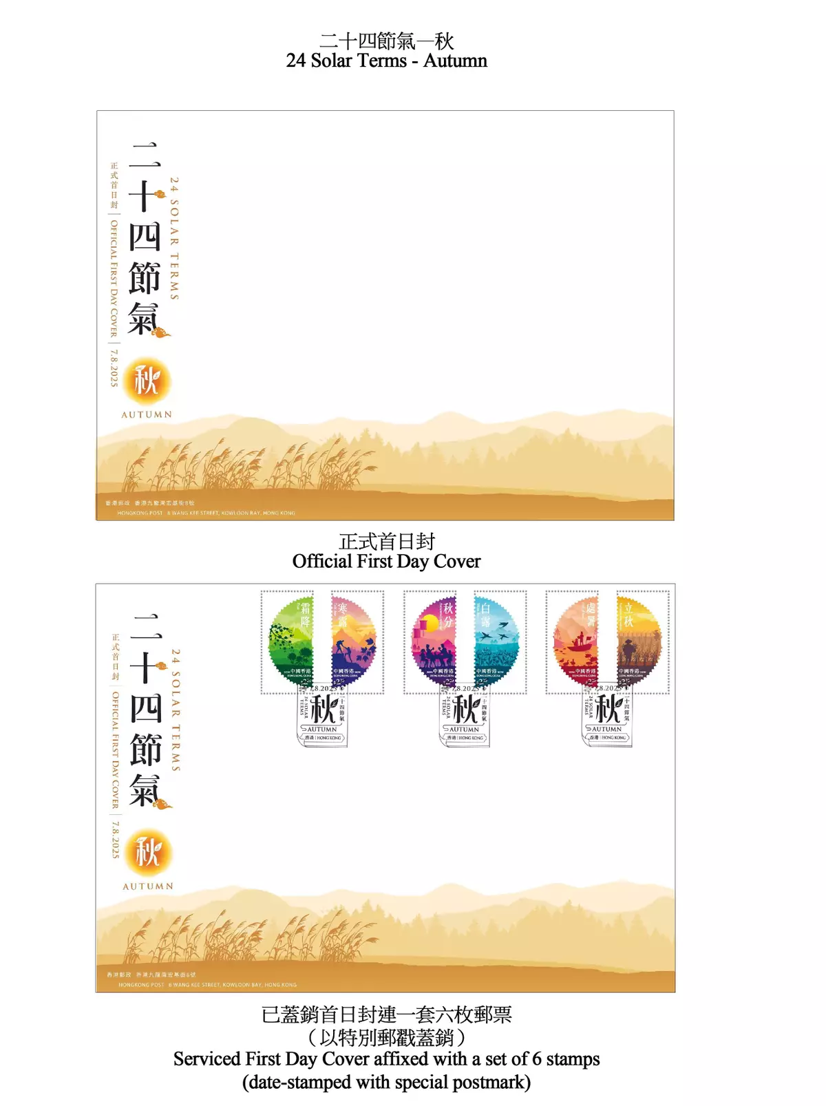 Official first day covers for "24 Solar Terms - Autumn" will be on sale at all post offices and Hongkong Post's online shopping mall ShopThruPost (shopthrupost.hongkongpost.hk) from tomorrow (July 24). This set of special stamps and associated philatelic products will be on sale at all post offices and ShopThruPost from August 7, while serviced first day covers affixed with the special stamps will be available at philatelic offices only.