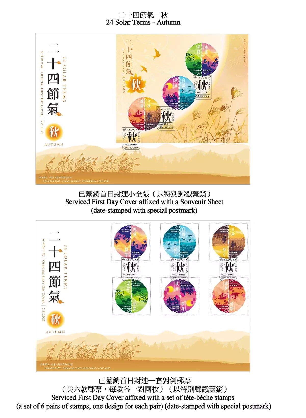 Hongkong Post announced today (July 23) that a set of special stamps and associated philatelic products on the theme of "24 Solar Terms - Autumn" will be released for sale on August 7 (Thursday).