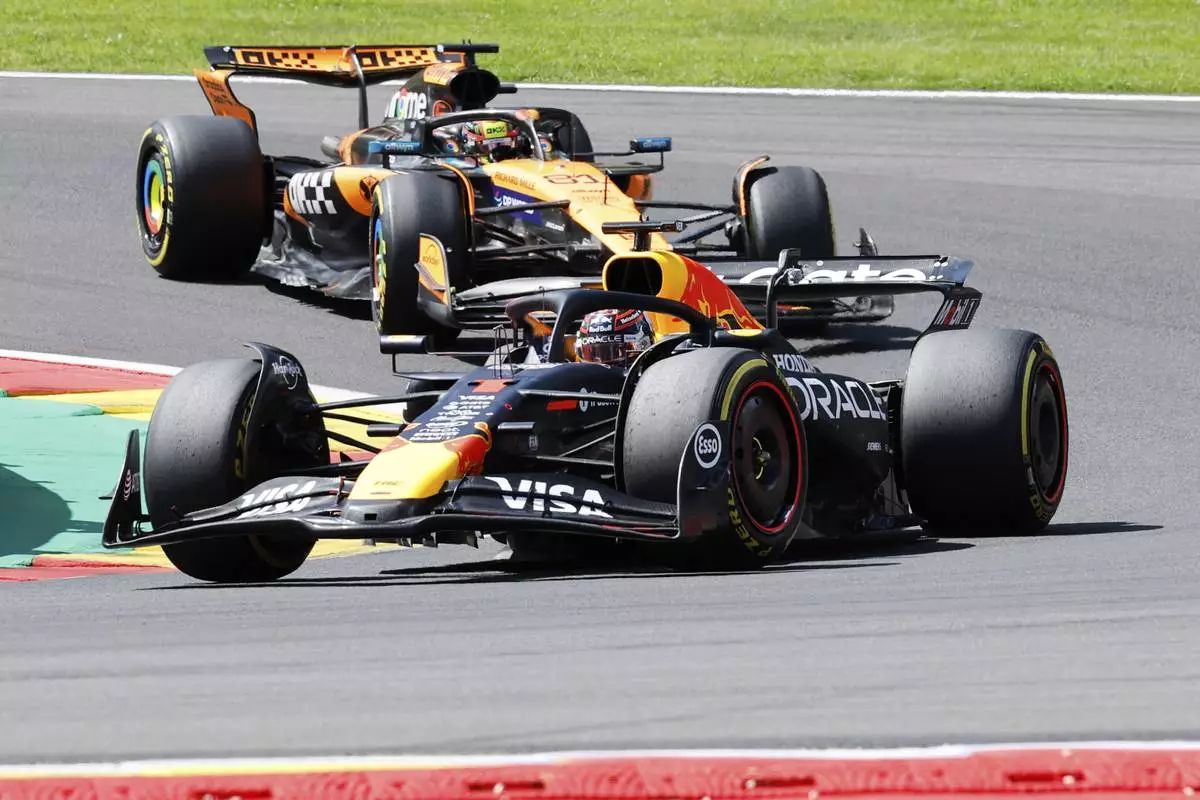 Red Bull driver Max Verstappen of the Netherlands, right, steers his car ahead of McLaren driver Oscar Piastri of Australia during the sprint race ahead of the Formula One Grand Prix at the Spa-Francorchamps racetrack in Spa, Belgium, Saturday, July 26, 2025. (AP Photo/Geert Vanden Wijngaert)
