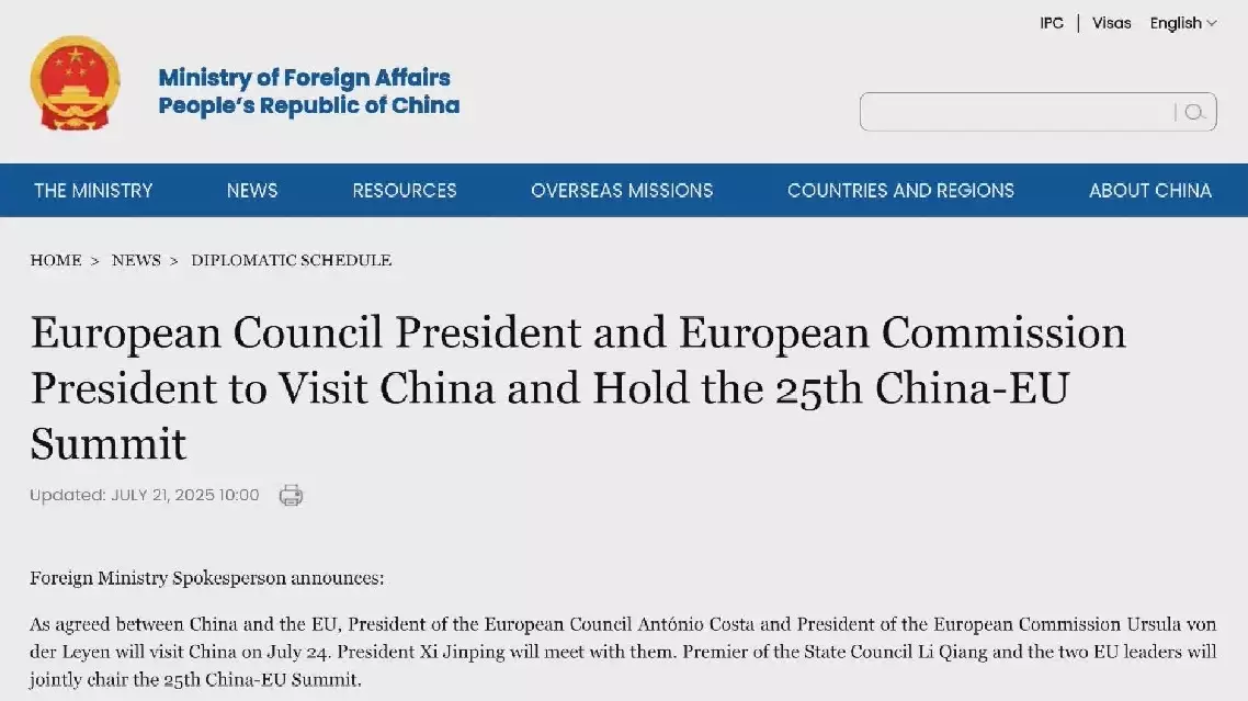 According to the ministry, Premier Li Qiang and the two EU leaders will jointly chair the 25th China-EU Summit in Beijing on Thursday.