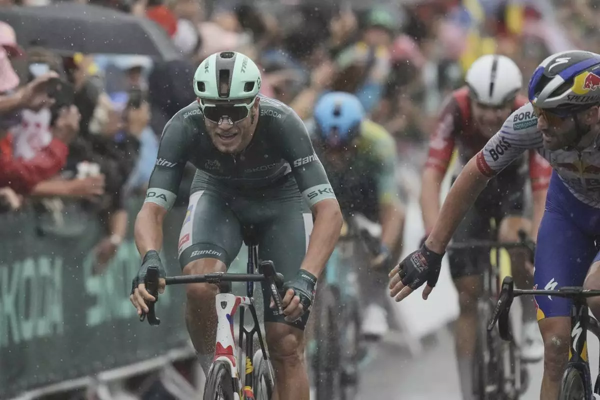 Italian rider Milan, the green jersey holder, consolidated his lead in the points classification with an explosive finish to get his wheel just over the line ahead of Jordi Meeus, Tobias Lund Andresen, Arnaud De Lie, Davide Ballerini and others in a rain-soaked sprint finale.