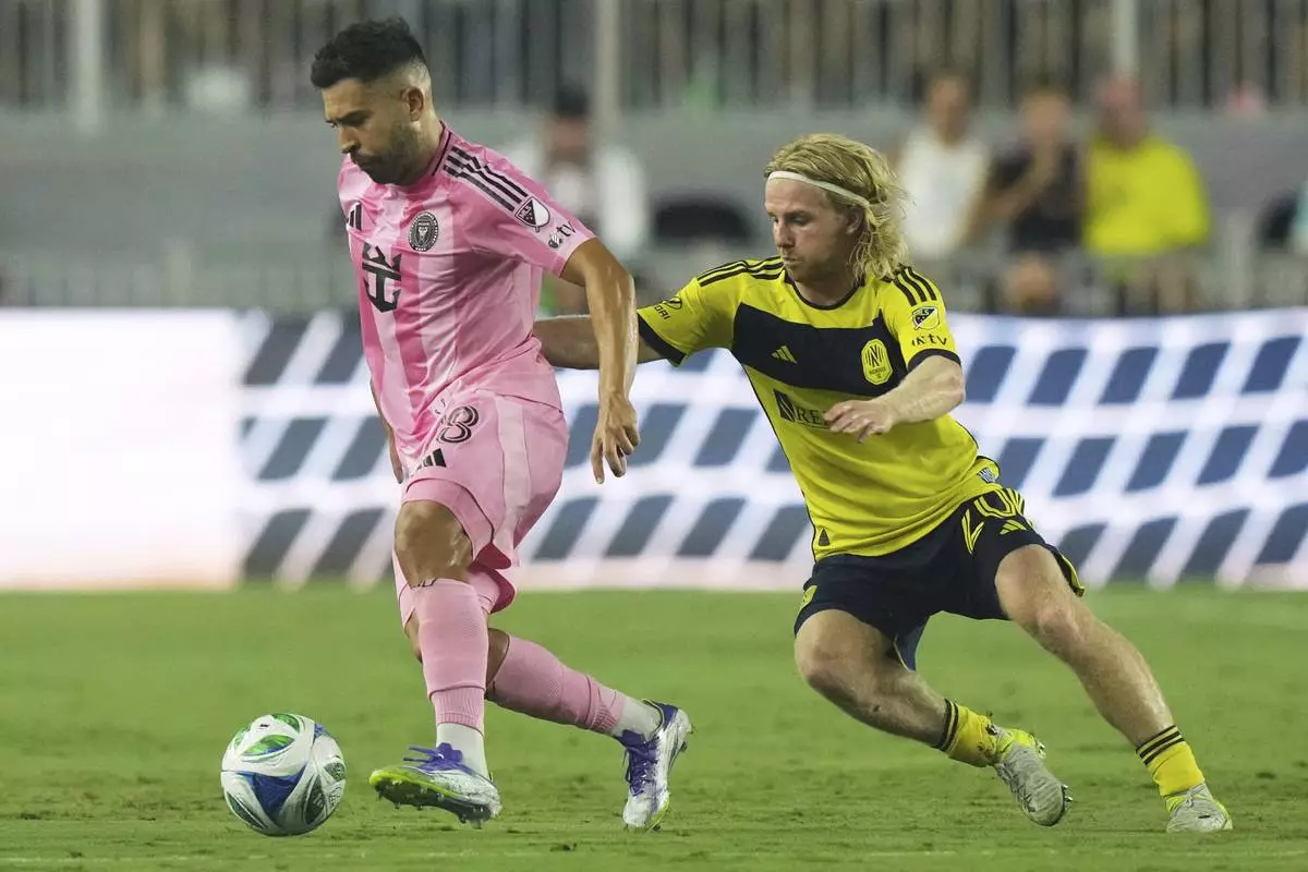 Inter Miami defender Jordi Alba (18) runs with the ball as Nashville SC midfielder Edvard Tagseth (20) defends during the second half of an MLS soccer match, Saturday, July 12, 2025, in Fort Lauderdale, Fla. (AP Photo/Lynne Sladky)
