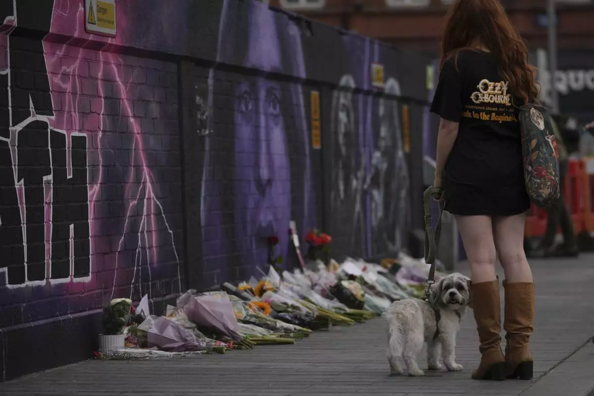 A music fan commemorates the death of Ozzy Osbourne in Birmingham, Wednesday, July 23, 2025. (AP Photo/Kin Cheung)