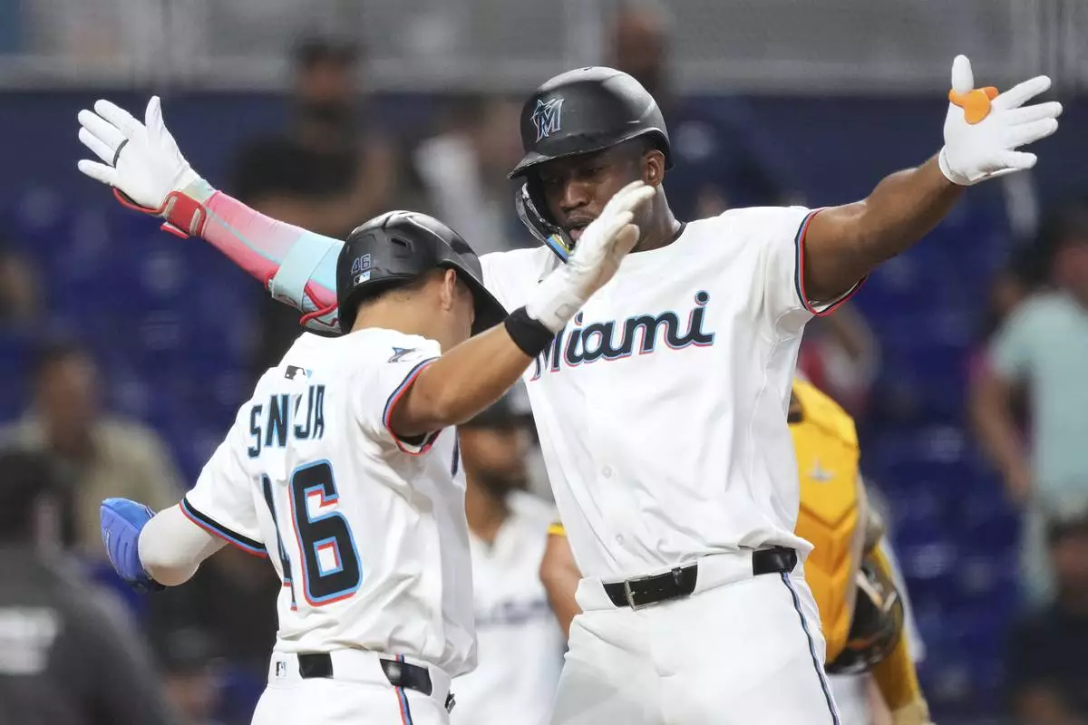 Miami Marlins' Jesus Sanchez, right, celebrates after hitting a home run that also brought home Javier Sanoja, left, in the fifth inning of a baseball game against the San Diego Padres, Wednesday, July 23, 2025, in Miami. (AP Photo/Rebecca Blackwell)