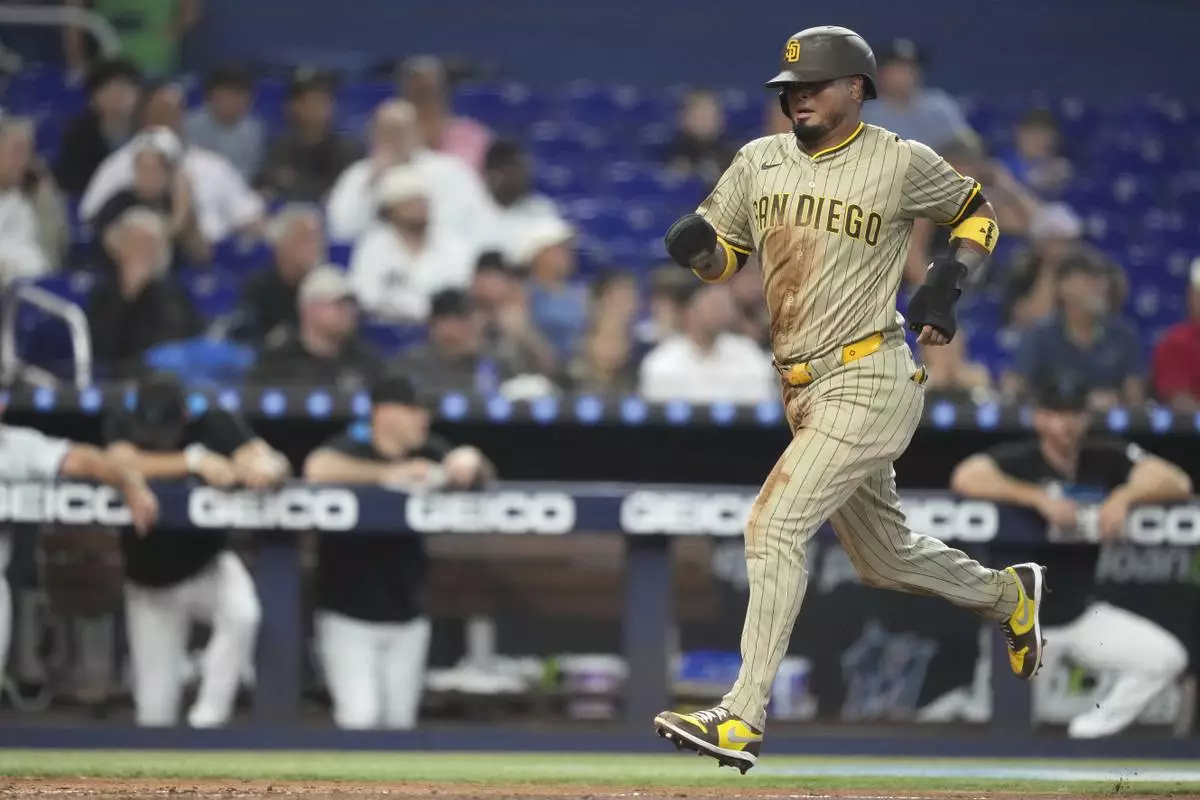 San Diego Padres' Luis Arraez runs home on a single by Manny Machado in the fourth inning of a baseball game against the Miami Marlins, Wednesday, July 23, 2025, in Miami. (AP Photo/Rebecca Blackwell)