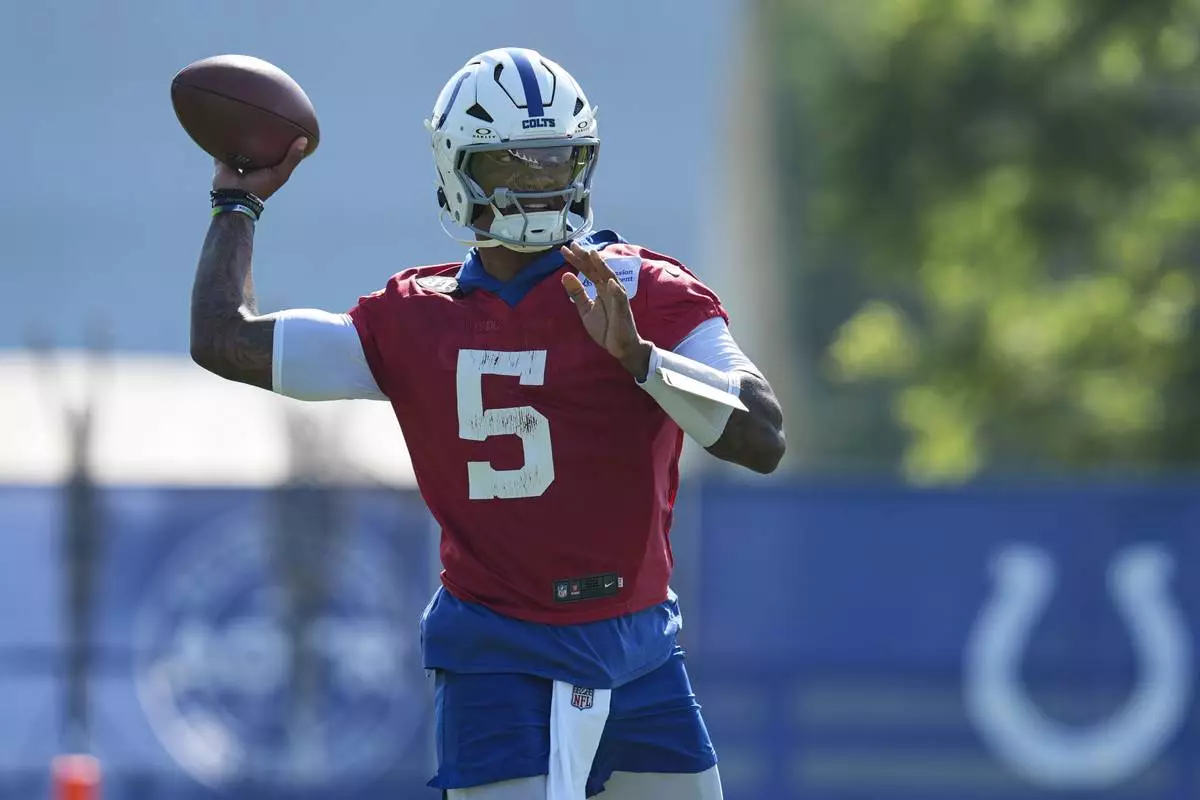 Indianapolis Colts quarterback Anthony Richardson Sr. (5) throws during practice at the NFL football team's training camp in Westfield, Ind., Wednesday, July 23, 2025. (AP Photo/Michael Conroy)