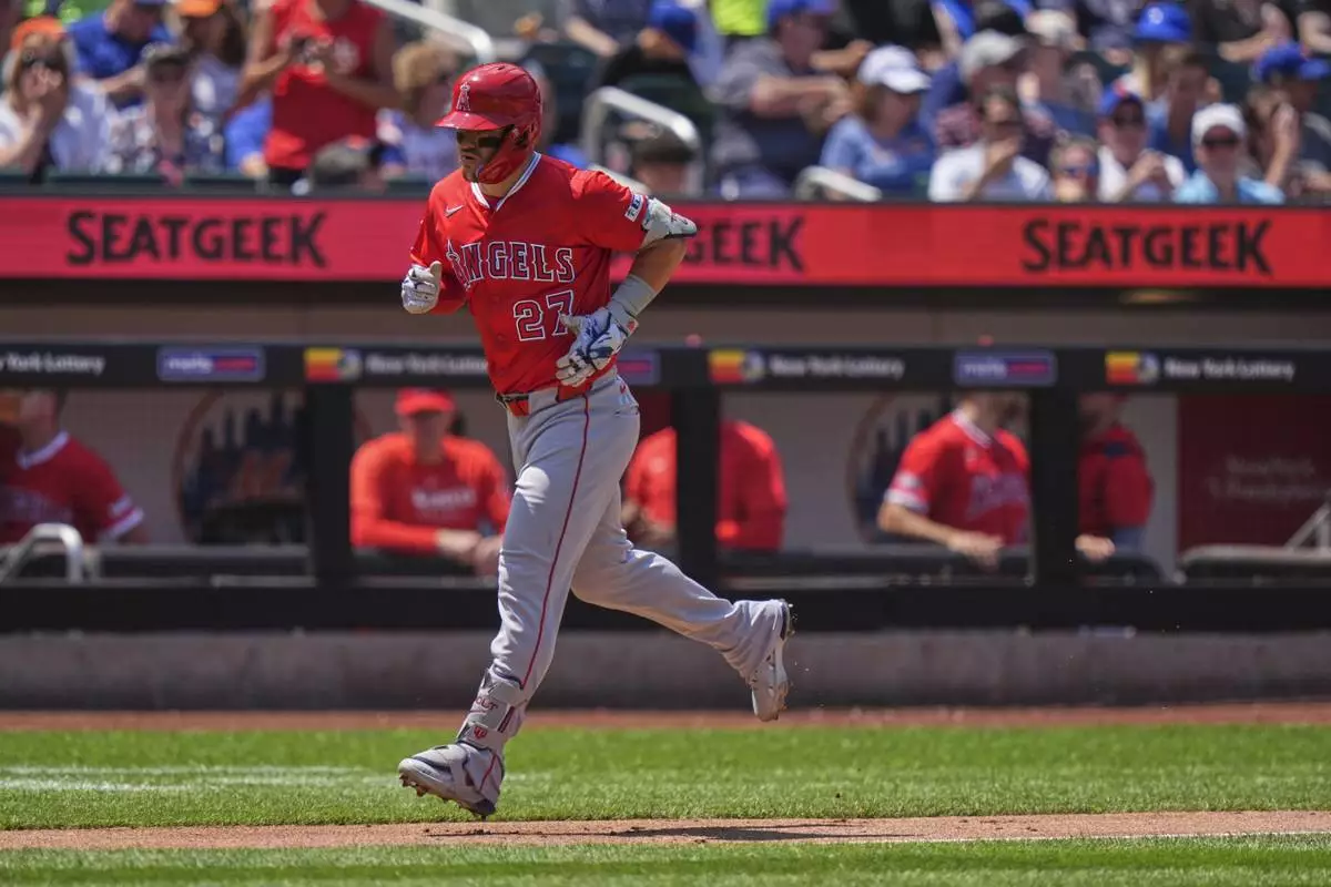 Los Angeles Angels' Mike Trout (27) runs the bases after hitting a home run during the third inning of a baseball game against the New York Mets Wednesday, July 23, 2025, in New York. (AP Photo/Frank Franklin II)