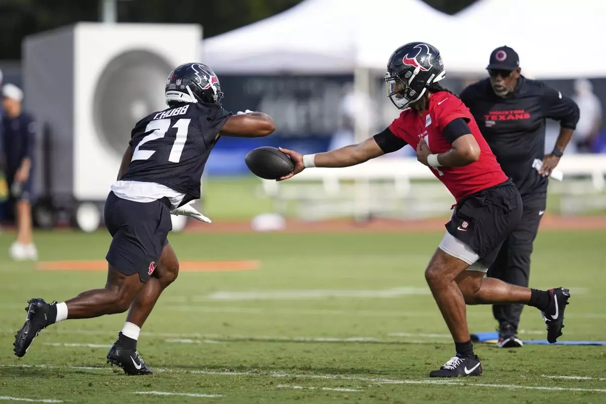 Houston Texans quarterback C.J. Stroud, right, hands off to runningback Nick Chubb (21) during the team's NFL football training camp Wednesday, July 23, 2025, in Houston. (AP Photo/Ashley Landis)