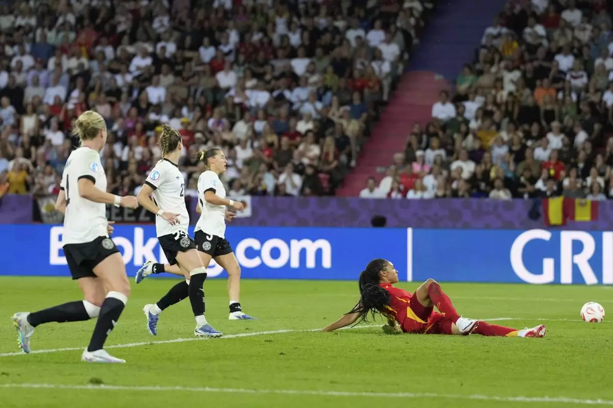 Germany players watch as Spain's Salma Paralluelo fails to connect with the ball in front of the goal during the Women's Euro 2025 semifinals soccer match between Germany and Spain at Stadion Letzigrund in Zurich, Switzerland, Wednesday, July 23, 2025. (AP Photo/Alessandra Tarantino)