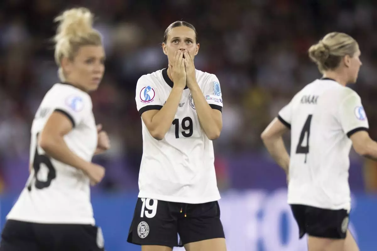 Germany's Klara Buehl reacts after a free kick during the Women's Euro 2025 semifinal soccer match between Germany and Spain at the Letzigrund stadium in Zurich, Switzerland, Wednesday, July 23, 2025. (Til Buergy/Keystone via AP)